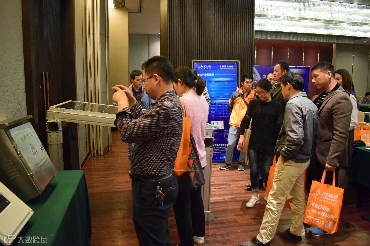会议现场摆放着晶澳家庭光伏系统的核心组件:305W组件和晶澳逆变器,洽谈期间不少来宾纷纷上前了解咨询,现场业务员积极为其解答。