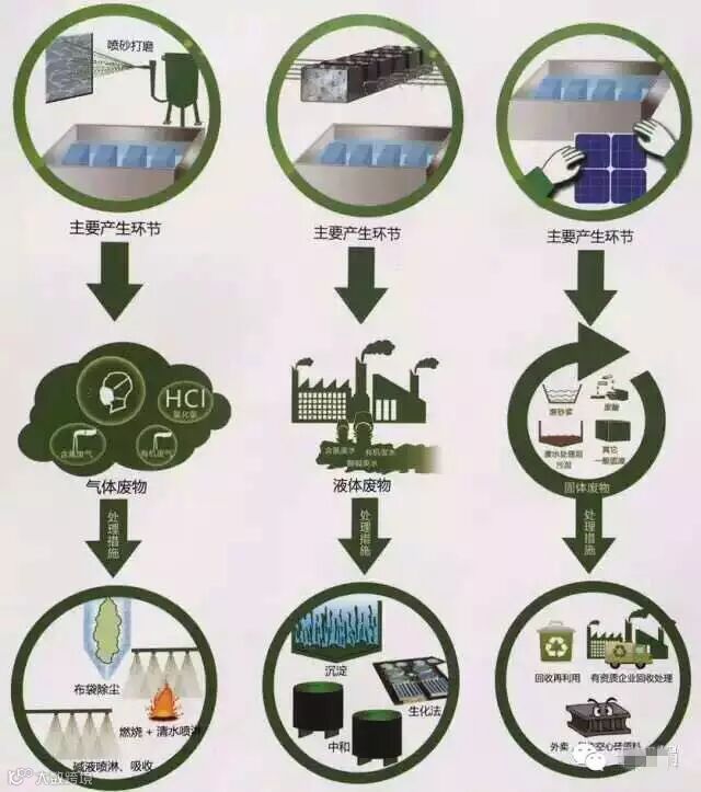 生产制造过程中会产生一定的废气、废水或固体废物,统称三废,晶体硅光伏制造过程也不例外。下图展示了晶体硅光伏制造过程中产生“三废”种类、主要产生环节及处理措施。光伏制造过程中产生的绝大部分污染物经简单护理后即可达到国家安全排放标准,处理过程简单且工艺成熟,对环境影响比较小;个别集中光伏生产行业持有的污染物,如四氯化硅、废砂浆以及氟化物,如下图所示。
