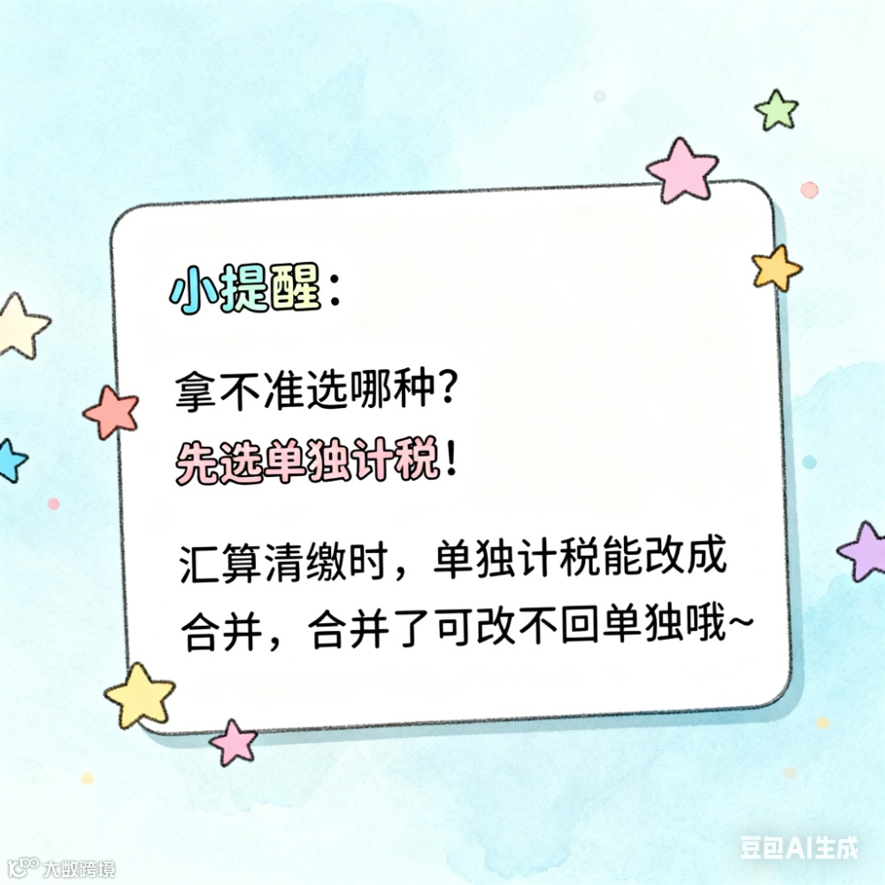 小提醒:拿不准选哪种?先选单独计税!汇算清缴时,单独计税能改成合并,合并了可改不回单独哦~