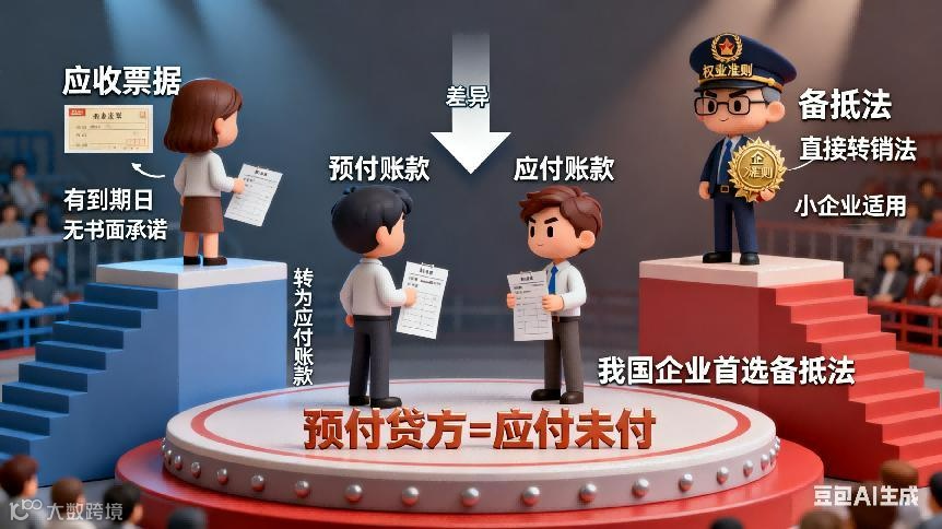 预付账款 vs 应付账款:预付账款是资产(预先付款),应付账款是负债(应付未付),预付账款贷方余额本质是应付账款。