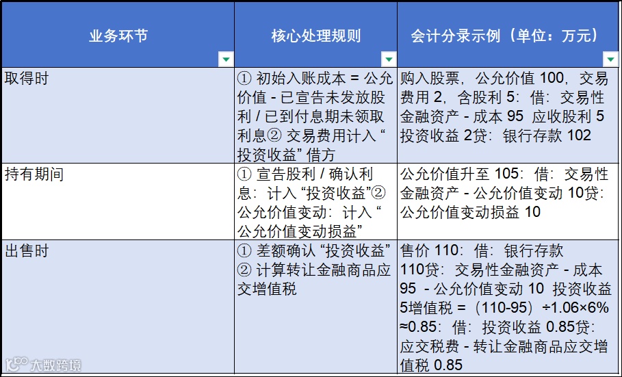 易错点:交易费用不计入初始成本(区别于其他金融资产);转让金融商品增值税计算基数为 “卖出价 - 买入价”(买入价不含已宣告未发放股利)。