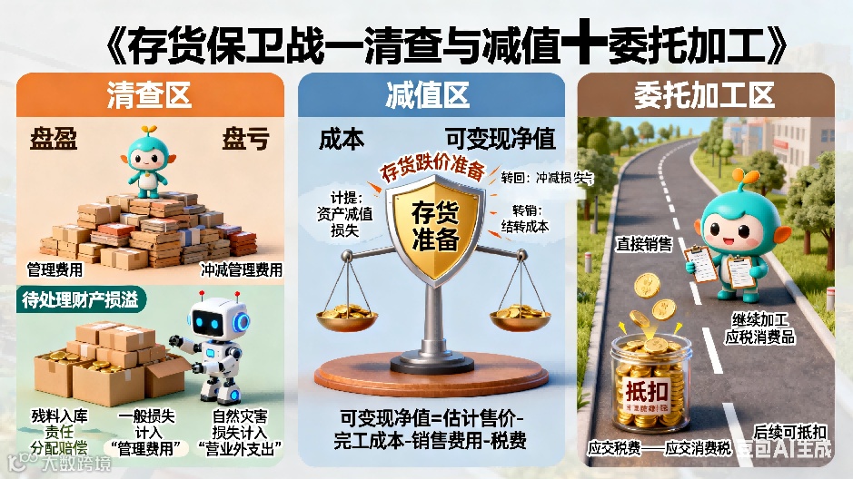 易错易混点辨析合理损耗 vs 非正常损耗:合理损耗:采购过程中不可避免的损耗(如运输途中少量挥发),计入存货采购成本,不影响总金额但提高单位成本;非正常损耗:管理不善、自然灾害等导致的损耗,不计入成本,计入当期损益(管理费用 / 营业外支出)。材料成本差异率正负含义:差异率为正:超支差异(实际成本>计划成本),发出材料需多结转成本;差异率为负:节约差异(实际成本<计划成本),发出材料需少结转成本。存货跌价准备 vs 固定资产减值准备:存货跌价准备:减值因素消失后可转回;固定资产减值准备:一经计提,不得转回。委托加工物资消费税归属:关键看 “收回后用途”,直接销售计入成本,继续加工可抵扣,避免混淆导致成本或税费核算错误。