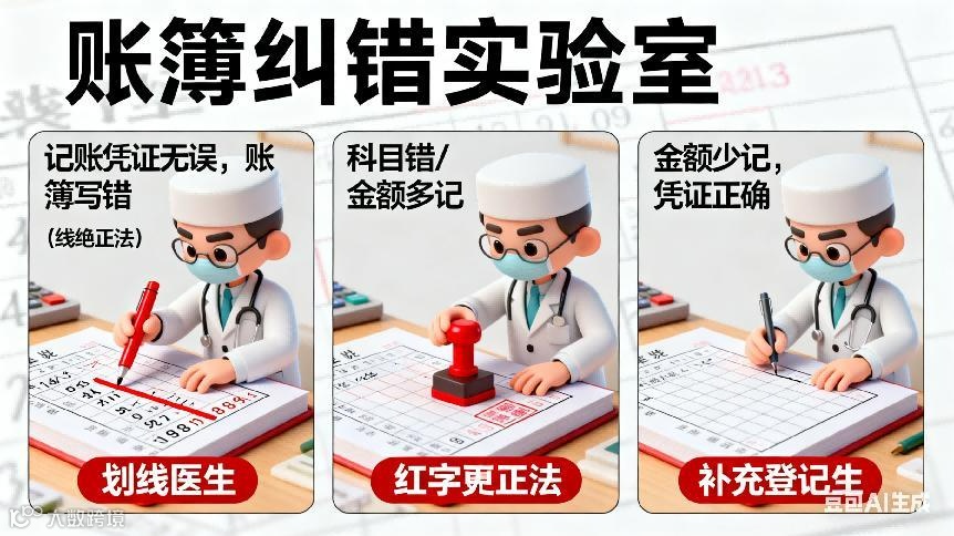 三种错账更正方法适用场景:划线更正法(记账凭证无误、账簿记录错误);红字更正法(记账凭证科目错误或金额多记);补充登记法(记账凭证金额少记)。