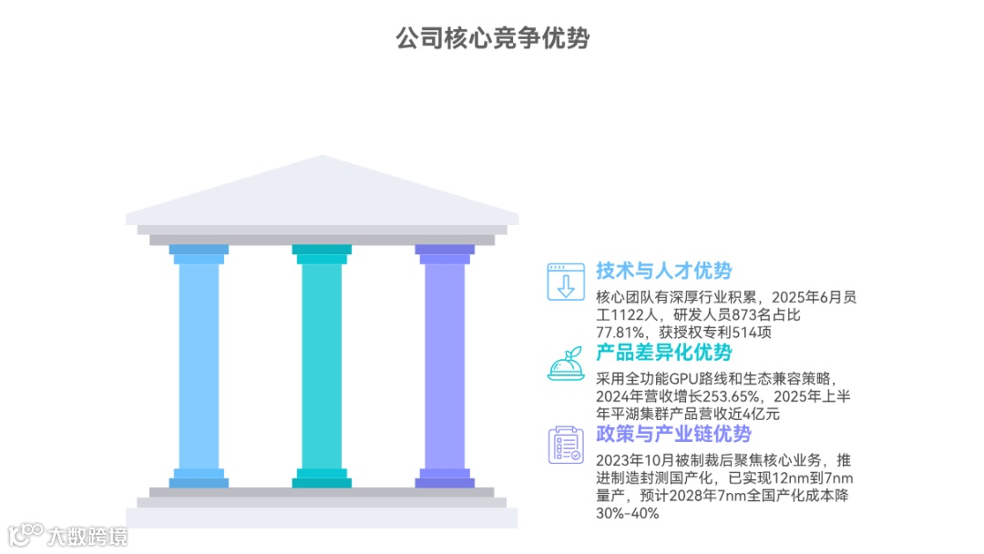 高速增长但仍未盈利:摩尔线程 2022 年至 2024 年营业收入复合增长率达 208.44%,2025 年上半年实现营业收入 7.02 亿元,超过前三年总和,但公司目前仍处于亏损状态,累计亏损超过 50 亿元