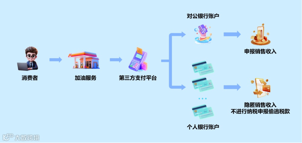 调取第三方支付流水后,偷税链条清晰呈现:加油站绑定负责人及亲属 3 个私户,消费者付款后,资金经第三方平台直接转私户,绕开对公账户,形成 “消费者 — 第三方支付 — 个人账户” 闭环。最终结合加油机记录核实:4 年隐匿收入 1085.75 万元、少缴税费 158.38 万元。铁证面前,企业负责人承认 “以为私户收款查不到,没想到大数据能追溯每笔流水”。