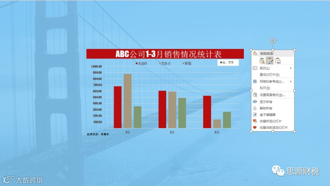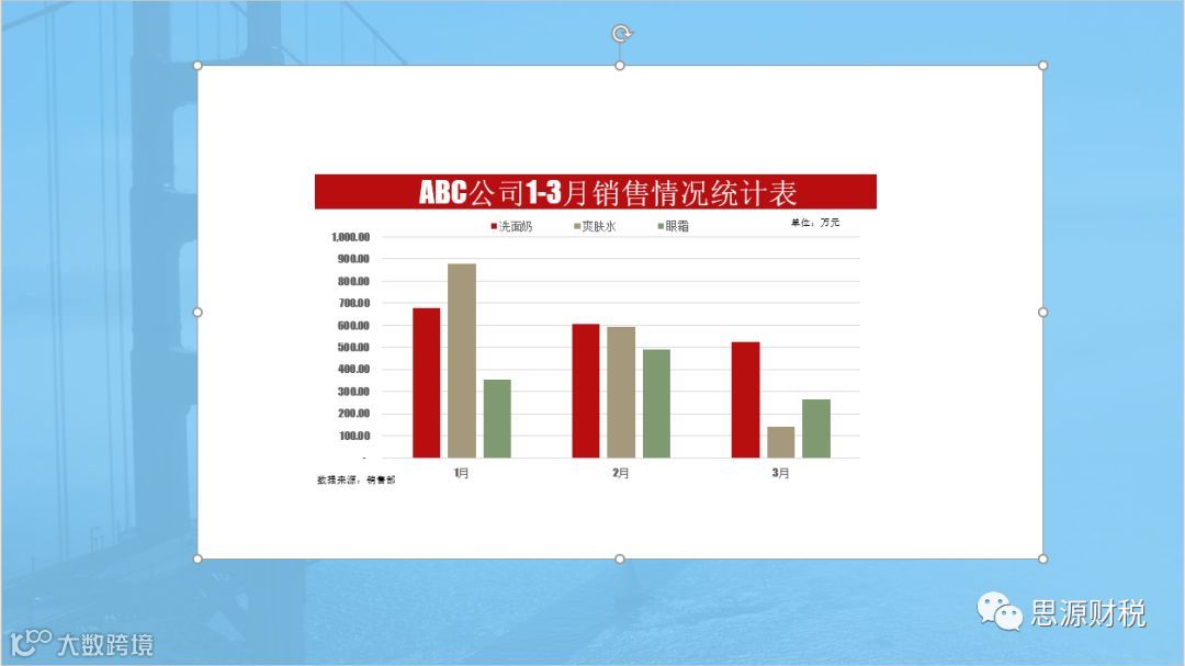 数据源:1-3月份洗面奶、爽肤水和眼霜的销售统计图表;