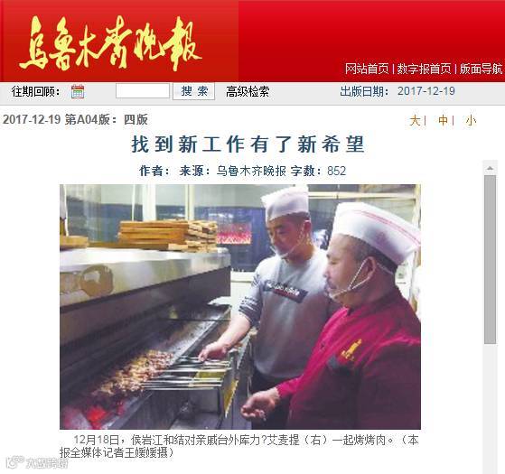 后堂透明的玻璃档口中可以看到厨师们忙碌着,其中一位维吾尔族大叔在娴熟的烤着羊肉串,脸上洋溢着灿烂的笑容。这位大叔名叫台外库力,今年50岁的他前几天还在为自己的工作而发愁, 因为之前工作的餐厅转让了,台外库力·艾麦提失业了。乌鲁木齐晚报社驻黑龙江社区“访惠聚”工作队第一书记、队长侯岩江是台外库力的结对亲戚,得知其失业后便带着台外库力开始找工作。