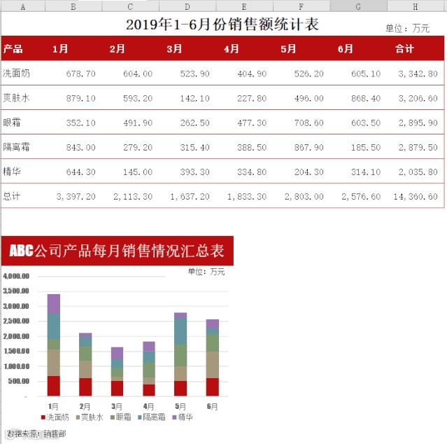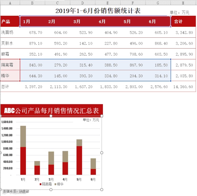 第五步:移动尺寸控点,选择1-6月份隔离霜和精华的数据,生成1-6月份隔离霜和精华可视化堆积柱形图,如图1-5;