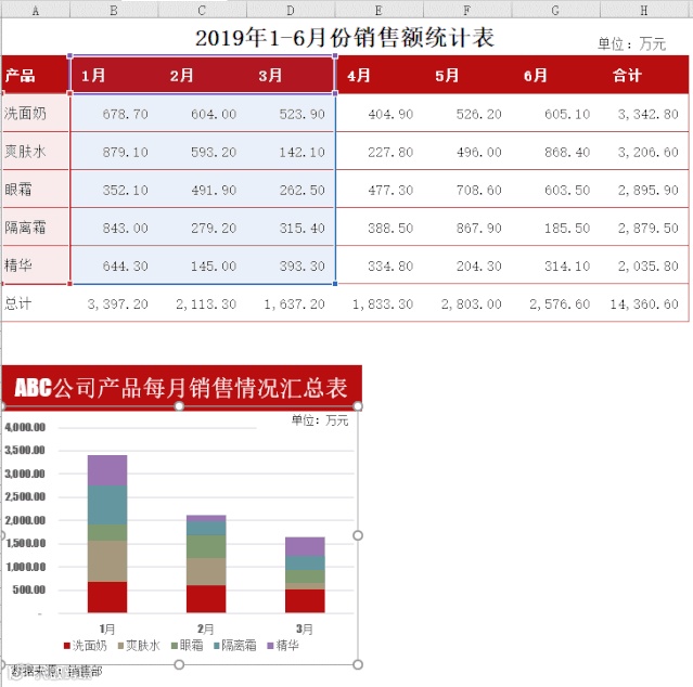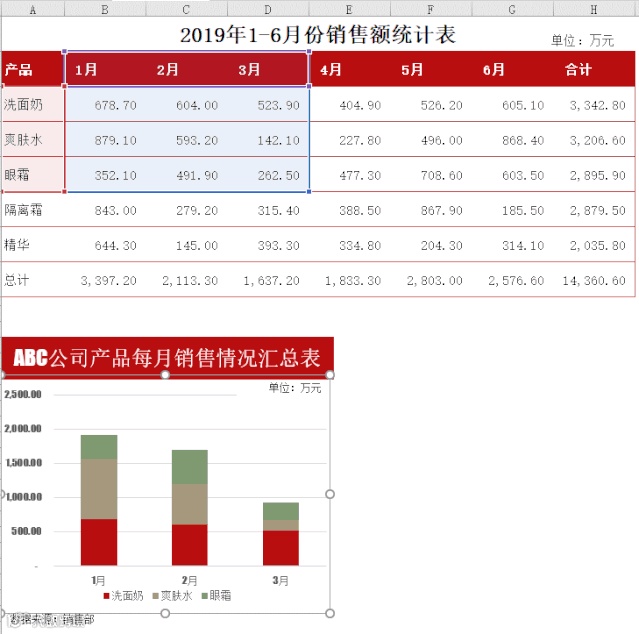 第四步:移动尺寸控点,选择1-3月份洗面奶、爽肤水和眼霜数据,生成1-3月份洗面奶、爽肤水和眼霜可视化堆积柱形图,如图1-4;