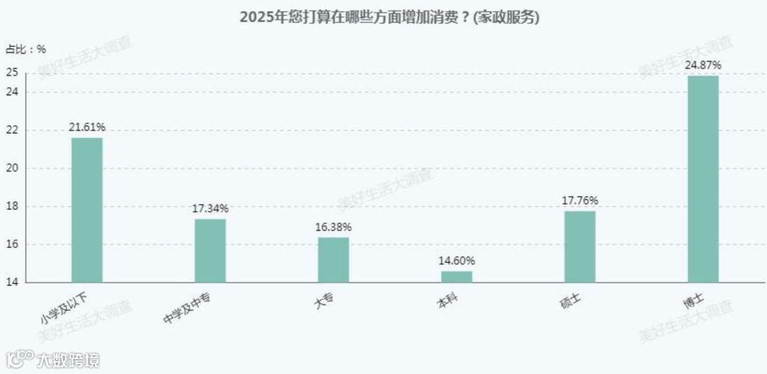 大调查发现,2025 年中国居民对家政服务的需求在性别、年龄上没有特别大的差距,但是在家庭年收入和文化程度上出现了明显的分化。从家庭年收入来看,低收入和高收入家庭对家政消费的需求整体上高于中间收入人群。从学历来看,博士和小学以下学历对家政服务消费预期最强,博士人数占比高达 24.87%,小学以下学历为 21.61%紧随其后,本科只有 14.60%。这说明,家政服务需求在收入分层和教育背景上存在“哑铃型”结构,这其中可能有的倾向为高端服务买单,有的可能有刚性照护需求,总之这反映出家政行业需要实施精准分层的服务策略,提供多样化、个性化的服务,以满足不同群体的具体需求。