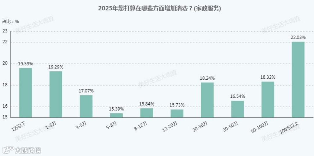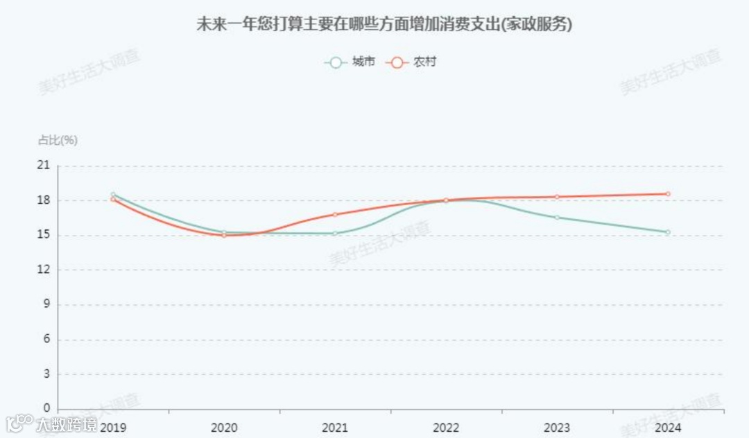 大调查发现,2025 年农村常住人口计划对家政服务增加消费的人数占比高出城市常住人口 3.29 个百分点。从时间曲线的走势上来看,农村领先城市的优势有逐渐拉大的趋势。这一方面可见政策驱动效应的显现,2021年商务部等14部门推出了《家政兴农行动计划(2021-2025年)》,推动了农村劳动力与消费市场双向激活;另一方面也说明农村消费结构升级,消费观念从“生存型”转向“品质型”,对家政需求不断增长。