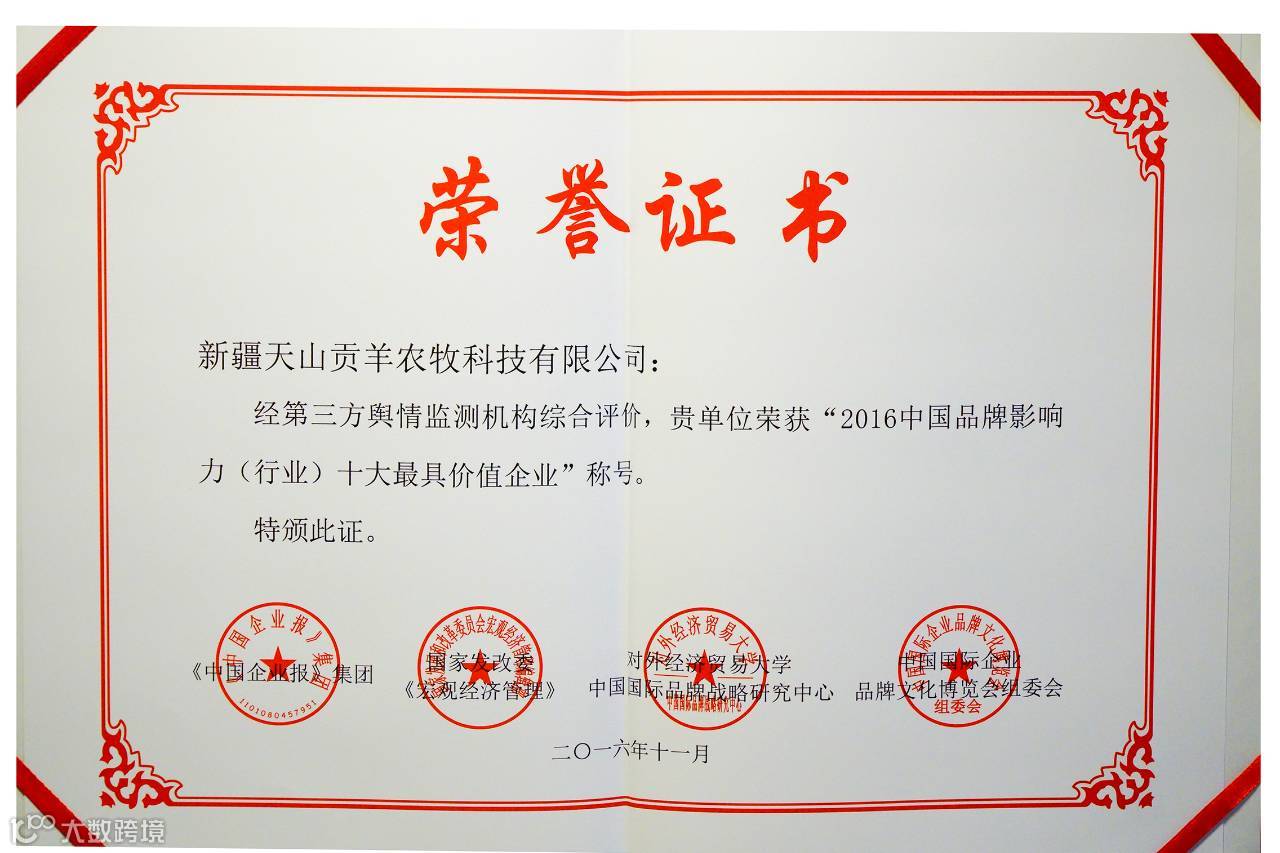 新疆天山贡羊又传来喜讯:新疆天山贡羊荣获“2016中国品牌影响力(行业)十大最具价值企业”奖项。