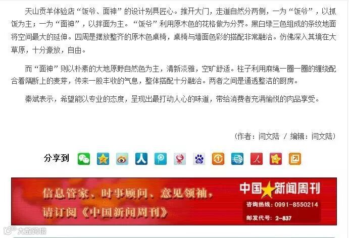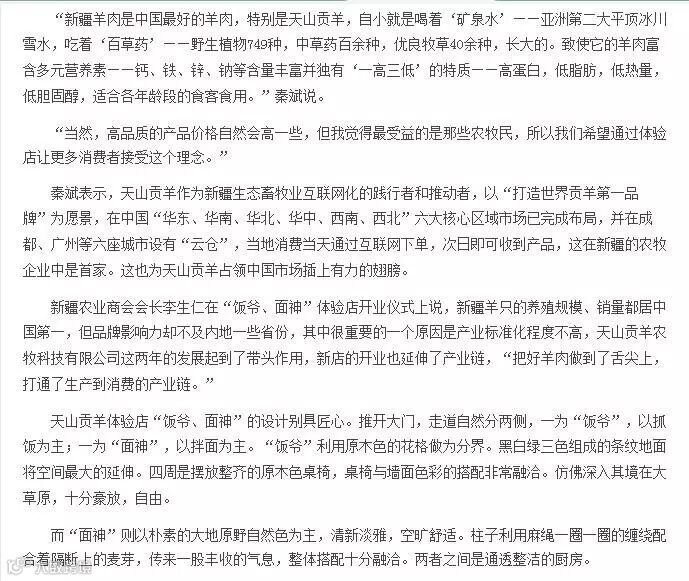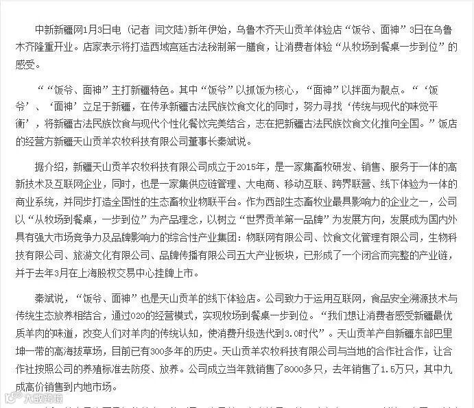 于2017年1月3日开业的新疆天山贡羊饮食文化管理有限公司旗下的“饭爷、面神”餐厅,在开业当天就吸引了国内众多知名媒体的报道。