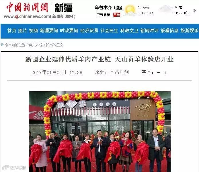 开业当天下午,中国新闻网-新疆新闻网的闫文陆记者在第一时间以“新疆企业延伸优质羊肉产业链,天山贡羊体验店开业”为标题进行了报道。