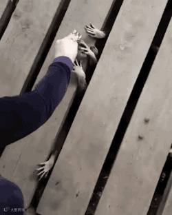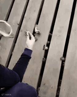 在木板上喂木板下的浣熊吃的东西的样子,这场景怎么这么可怕啊!