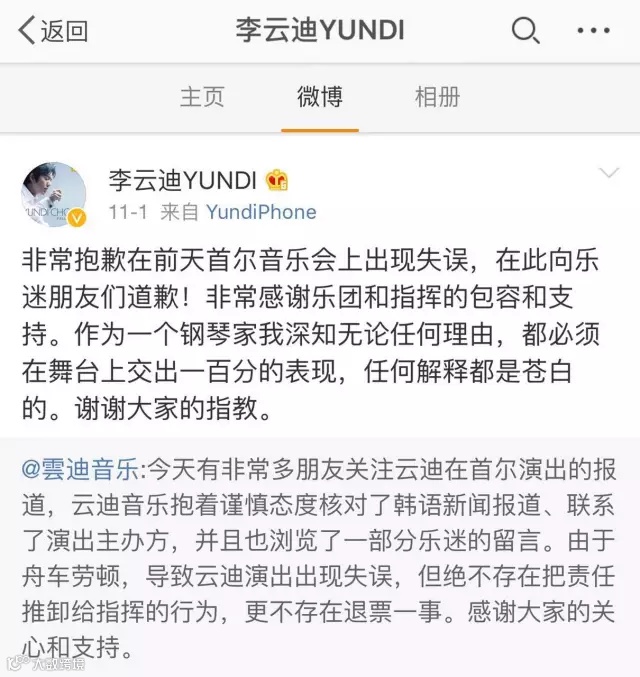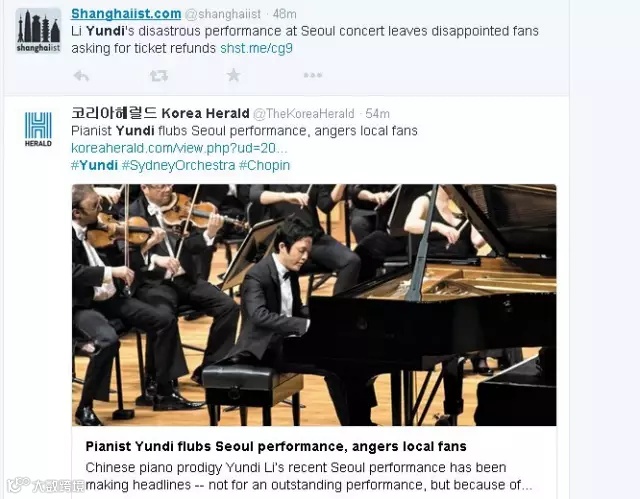日前,有来自韩国媒体的消息称,在韩国举行钢琴巡演的中国著名钢琴师李云迪,在10月30日于首尔举行的一场音乐会上,发生了“严重的错误”,居然“忘谱”了。这家韩国媒体还“绘声绘色”地表述称:1、李云迪犯错后“当即就丢下与之合作的悉尼交响乐团,没有谢幕就离场了”,2、“他还将错误都归咎给了悉尼交响乐团的指挥”,3、“大量的观众要求退票”。
