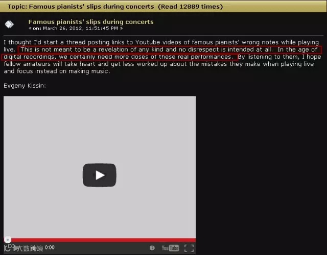 实际上,在不少国外的乐迷看来,比如在Slippedisk.com上,就有不少国外的古典音乐爱好者针对这次事故表示,“人非圣贤,孰能无过”。他们甚至觉得,优秀的钢琴师也会犯错,才是他们人性一面的展示,证明他们不是“机器”。这种认识或许也是东西方一种“惯性思维”上的差异所致:我们恨不得将每一个人都塑造成不能出错的机器,而一旦这样一部“完美的机器”犯错了,就会立刻被全盘否定;而西方则更看重“真实”,反而厌烦这种把人像“机器”一样要求的心理。