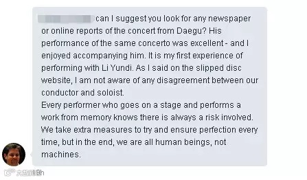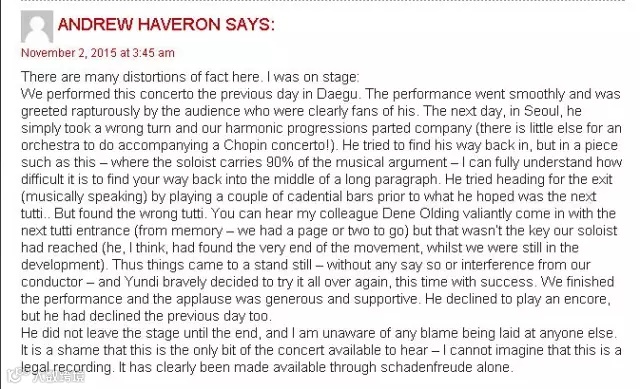 但有趣的是,在这篇英文的报道下面,一个名叫Andrew Haveron的网友的留言吸引了我的目光。他宣称自己当晚就在现场,并澄清说媒体的报道很多都与事实相违背。比如李云迪并没有责怪指挥,更没有犯错后就丢下交响乐团直接离场,而是弹完了所有的演出内容,谢幕后才离场的,只是他没有进行“加演”而已,但前一天在大邱他也没有进行“加演”。