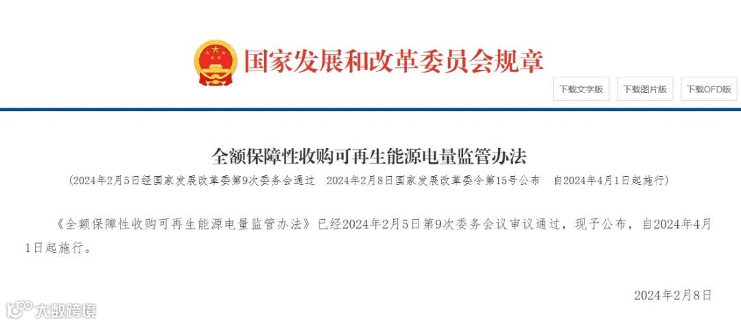 3月18日,国家发展改革委发布《全额保障性收购可再生能源电量监管办法》(以下简称《监管办法》),以推动新型电力系统建设,规范电力市场相关成员全额保障性收购可再生能源电量行为。根据《监管办法》要求,新规自4月1日起施行,由原国家电力监管委员会于2007年9月1日印发施行的《电网企业全额收购可再生能源电量监管办法》(以下简称“原《办法》”)将在同日废止。