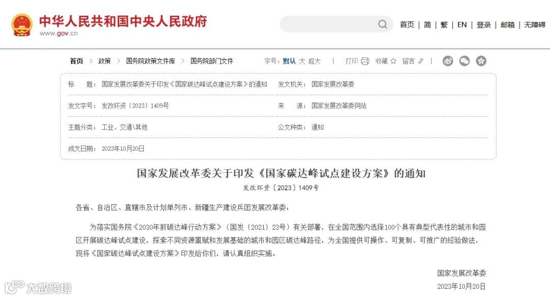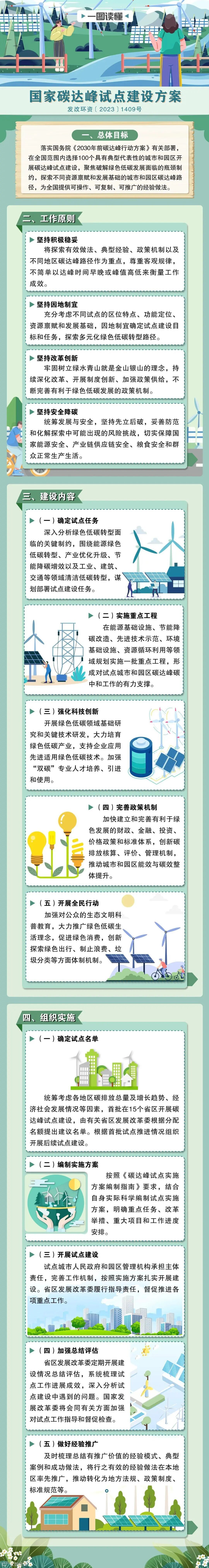 《国家碳达峰试点建设方案》是为全面贯彻党的二十大精神,认真贯彻落实党中央、国务院决策部署,按照《中共中央 国务院关于完整准确全面贯彻新发展理念做好碳达峰碳中和工作的意见》和国务院《2030 年前碳达峰行动方案》有关部署要求制定的方案。由国家发展和改革委员会于2023年10月20日印发实施。