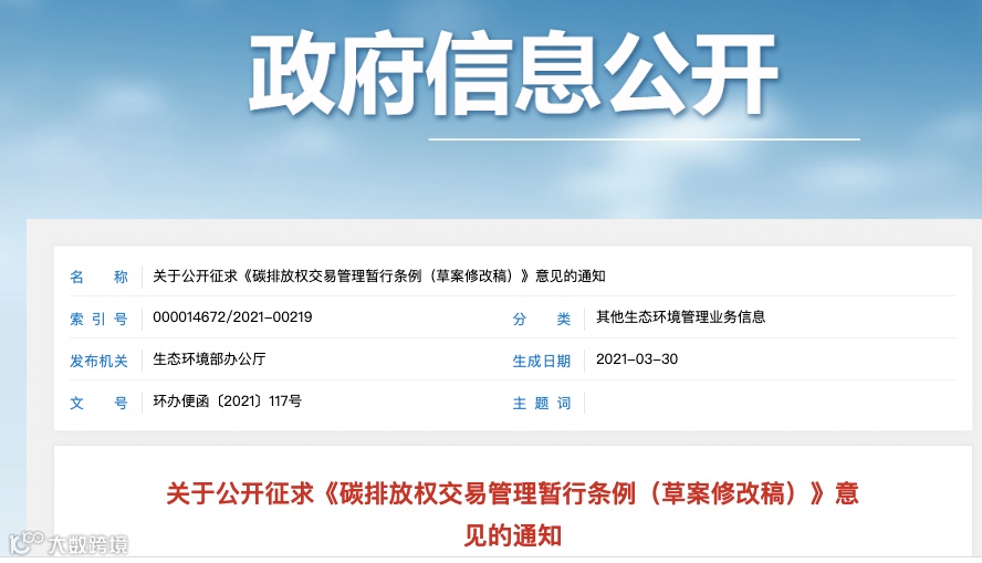 2021年3月30日,生态环境部发布关于公开征求《碳排放权交易管理暂行条例(草案修改稿)》意见的通知。暂行条例提出,碳排放配额分配包括免费分配和有偿分配两种方式,初期以免费分配为主,根据国家要求适时引入有偿分配,并逐步扩大有偿分配比例。目前北京、上海、武汉等区域碳市场已经引入配额竞拍模式,购买配额。