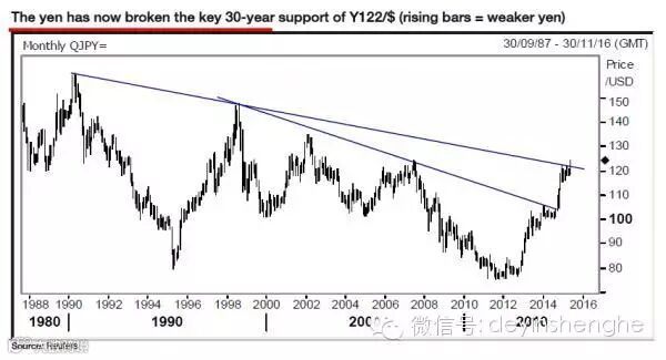 Albert Edwards是业内第一个预测日元将跌破122这一关键支撑位的外汇策略师,他此前称日元将跌至2002年的水平。不过,Albert Edwards也曾说,日元将于2015年三月底之前大幅贬值到145。现在看来,他预测的早了点儿。