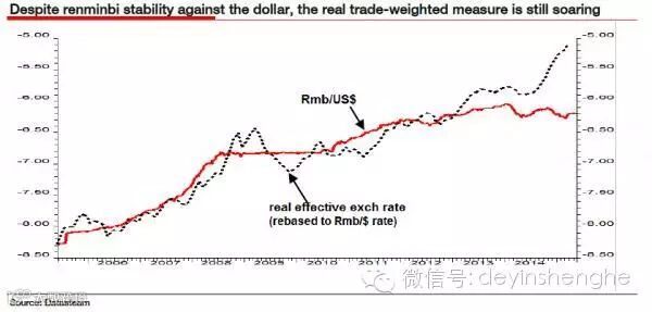 当下,日元贬值令我们想起1997年亚洲金融危机之前发生的事件。早在上世纪90年代中期,被低估的亚洲国家货币当时还在与美元挂钩,这些国家经济增长强劲,拥有大规模国际收支盈余。然而其后,随着通缩来临,一切都发生了逆转,亚洲国家实际汇率狂飙,竞争力受损,国际收支从盈余变成赤字。中国也未能幸免。在双边汇率保持稳定的情况下,实际贸易加权汇率仍持续上升(下图)。