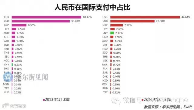 同样的,在环球同业银行金融电讯协会(SWIFT)全球支付货币中,人民币的占有率继续缓慢上升。截止2014年12月,人民币占全球支付货币市场份额的2.17%,较一年前的0.63%大幅上涨,使得人民币成为全球第五大支付货币,已经非常接近日元的2.69%。