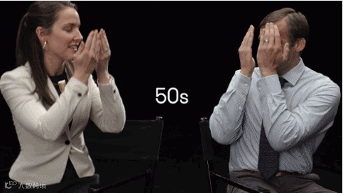 然后是他们70岁时候的样子,当他们放下双手看到彼此的时候,虽然还是带着笑容,但是显然被面前的这个皱纹满面、头发花白的老人吓了一跳。他们直观地看到了岁月在人身上留下的痕迹,他们开始感叹,是什么让彼此变得如此苍老。