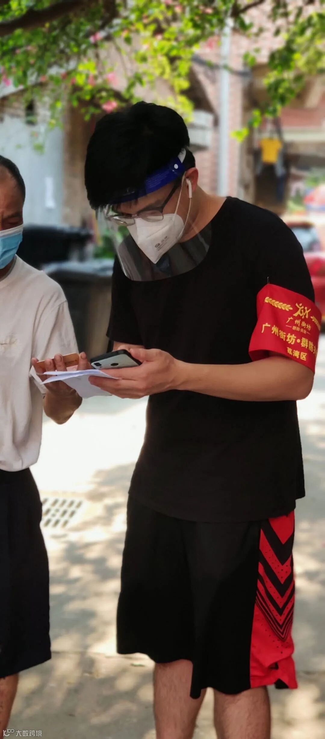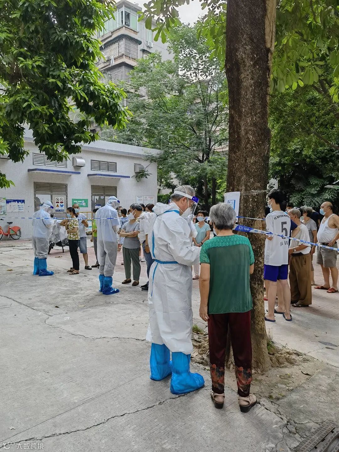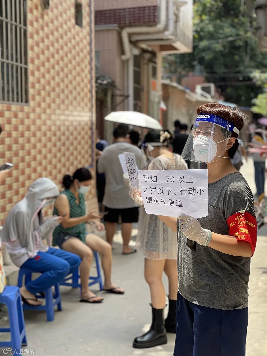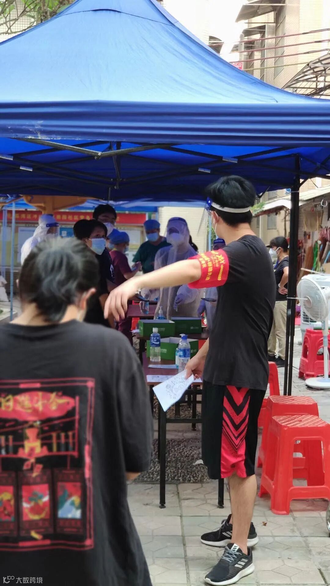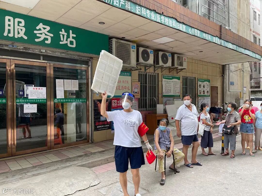 49岁的何爽,一头短发,穿着一身短袖运动装,戴着红袖章,在排队做核酸检测的人龙旁维持秩序,看上去特别精神。时不时有街坊路过跟她打招呼,她都响亮地回答,笑容满面。