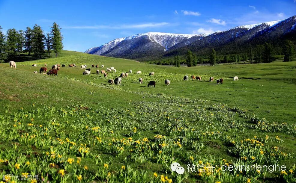 天山贡羊牧场自古以来就是一片优质的天然牧场,四面环山,森林茂密,绿草如茵,溪水潺潺,远眺山岚起伏雪峰苍松,近观炊烟袅袅牛羊成群。