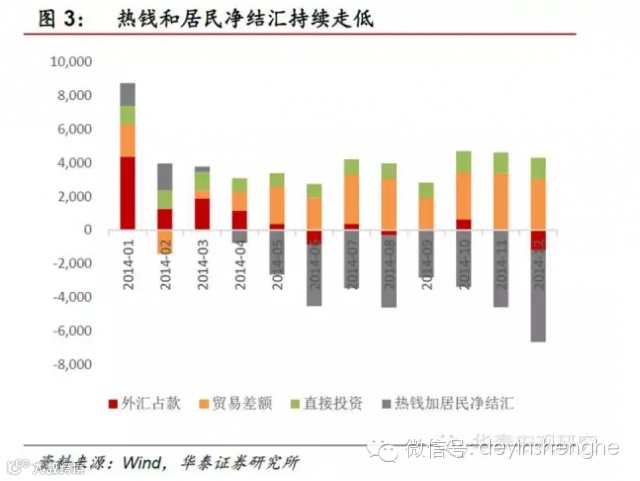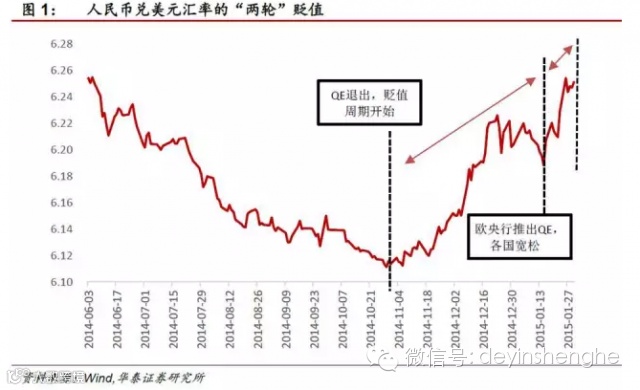 近期人民币兑美元加速贬值,理由我们在之前的报告中讲过,虽然美国四季度GDP增长2.6%不及预期,先行指标也暗示自12月份以来增长有趋缓迹象,但是美国经济复苏的大趋势目前还是没有变,因此中美利率周期的分化是人民币兑美元贬值的趋势性因素,而近期加速贬值很大程度上是因为欧洲央行QE引领的全球性宽松推升了美元指数。