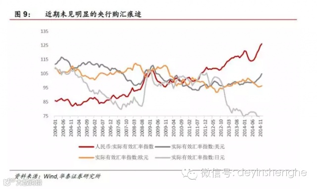 因此致辞我们可以总结一下了:基本面因素决定的利率周期分化是大趋势,在这个趋势上以欧洲央行QE为代表的非美国经济体的宽松加速了美元指数的走强从而造成人民币兑美元贬值,对其他货币升值的局面,实际有效汇率持续走强,而围绕人民币币值为基础的套利活动会加剧人民币的升值或贬值程度,除此之外,对于未来的人民币汇率我们有五点判断: