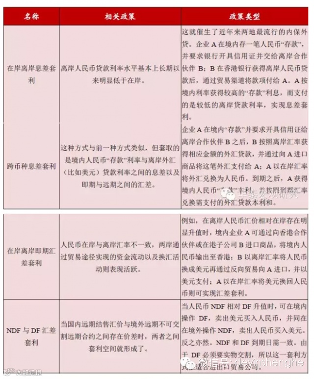 值得一提的是,除了来自于央行、在岸外汇市场、离岸外汇市场的供需力量对于人民币估值的影响外,一些交易性因素也在加剧人民币的波动。套利活动本质源于相对分割市场上资产定价的差异以及并不完全阻隔的通道,目前人民币兑美元汇率的套利完全存在这一条件。所以从过去到现在,通过以下的四类途径,套利者都在参与利差和息差的相关套利活动。