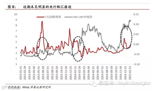 但看了14年初的情况后也许你会质疑流动性投放之后难道不应该正是形成贬值的压力么?那么上图中贬值压力与回购利率相反的形态似乎应该合情合理吧?但需要理解的是这要取决于汇率当时的趋势方向、流动性投放的过程是主动还是被动、以及宽松的量到底有多少,我们的观点是在升值预期中被动的投放流动性并不会形成较强的贬值预期。因此14年初的人民币贬值和回购利率下降是很特殊的时点,毕竟人民币在当时还站在升值的趋势上,按照我们上面的思路来解释当时的贬值预期的形成,一方面释放8000多亿的逆回购确实有些影响升值的基础,另一方面,我们更相信央行在离岸市场上进行了美元资产的购买操作并相应的改变了中间价的变化方向,主动引导人民币的贬值,这就是央行对于人民币的定价权的体现。