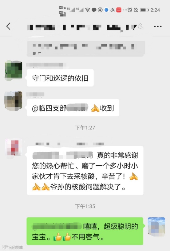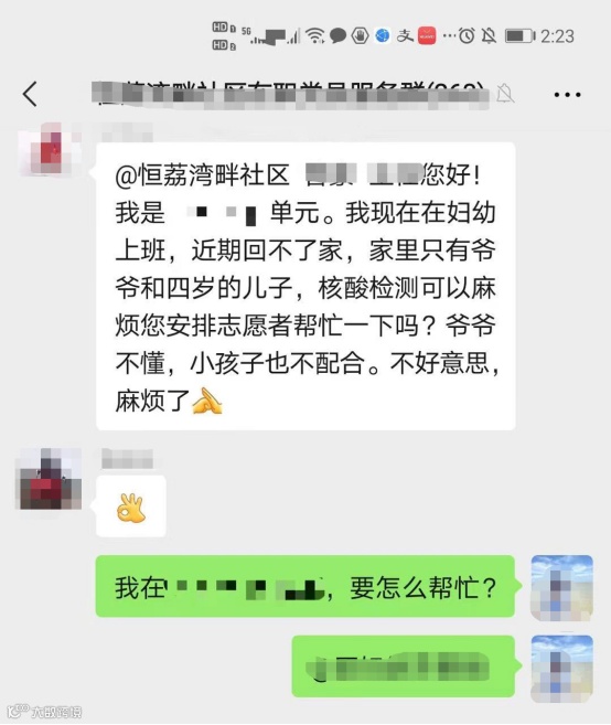 6月10日上午,正在居家办公查阅资料的党员钟丽华被一条手机微信信息打断了思路,她拿起手机查看,原来是小区在职党员服务群中,一位在医院上班的医护人员发出的求助信息,说自己正在医院一线抗疫,已经好多天没回家了,家中只有年近七旬的老爷爷和四岁的儿子,能否帮忙安排一位志愿者协助一老一少做核酸检测,因为老人不懂如何操作手机,小孩子也不会乖乖配合。
