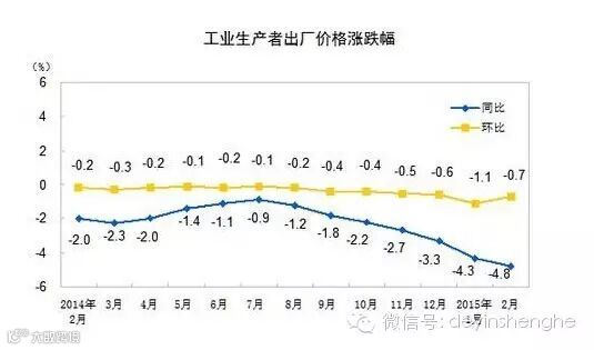 据国家统计局,2015年2月份,全国工业生产者出厂价格同比下降4.8%,环比下降0.7%,生产资料价格领跌。1-2月平均,工业生产者出厂价格同比下降4.6%,工业生产者购进价格同比下降5.5%。