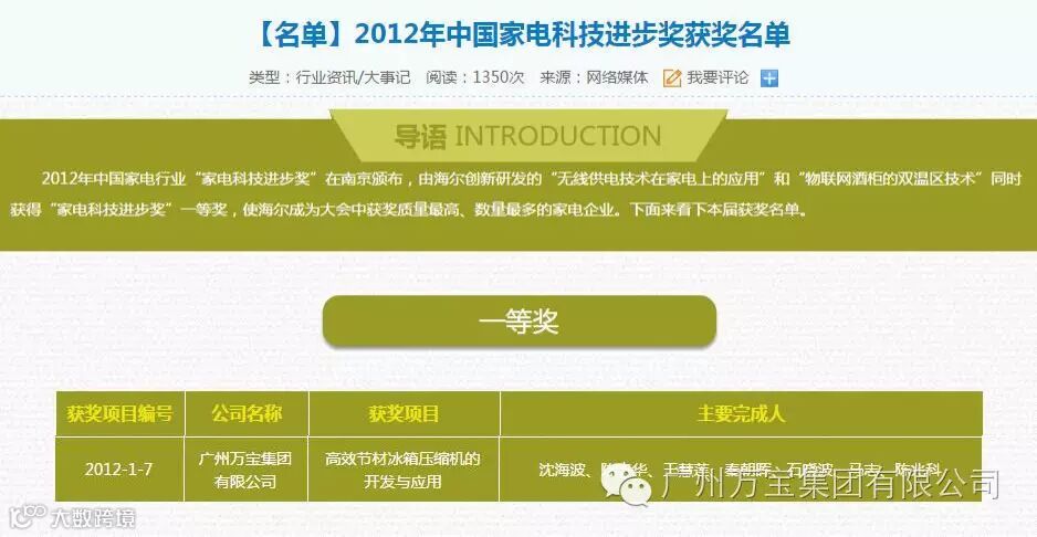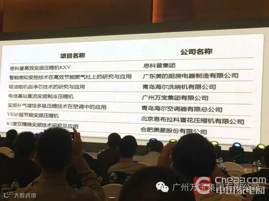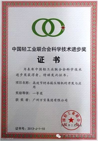 万宝集团“高效节材压缩机的开发与应用项目”获得中国家电科技进步奖一等奖。