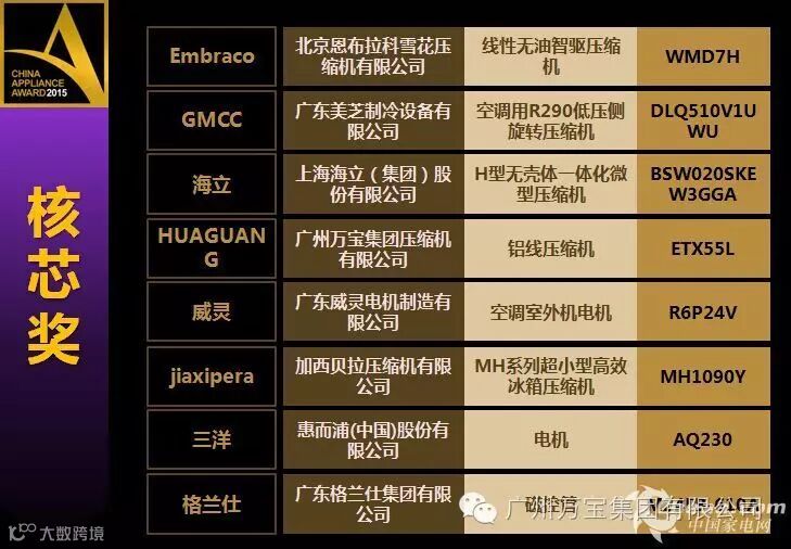 HUAGUANG牌铝线冰箱压缩机获中国家电艾普兰奖核芯奖。
