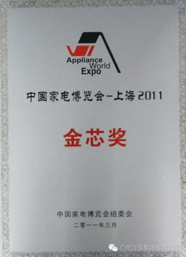 万宝集团冰箱压缩机在2011中国家电博览会获“技术创新金奖”——“金芯奖”。