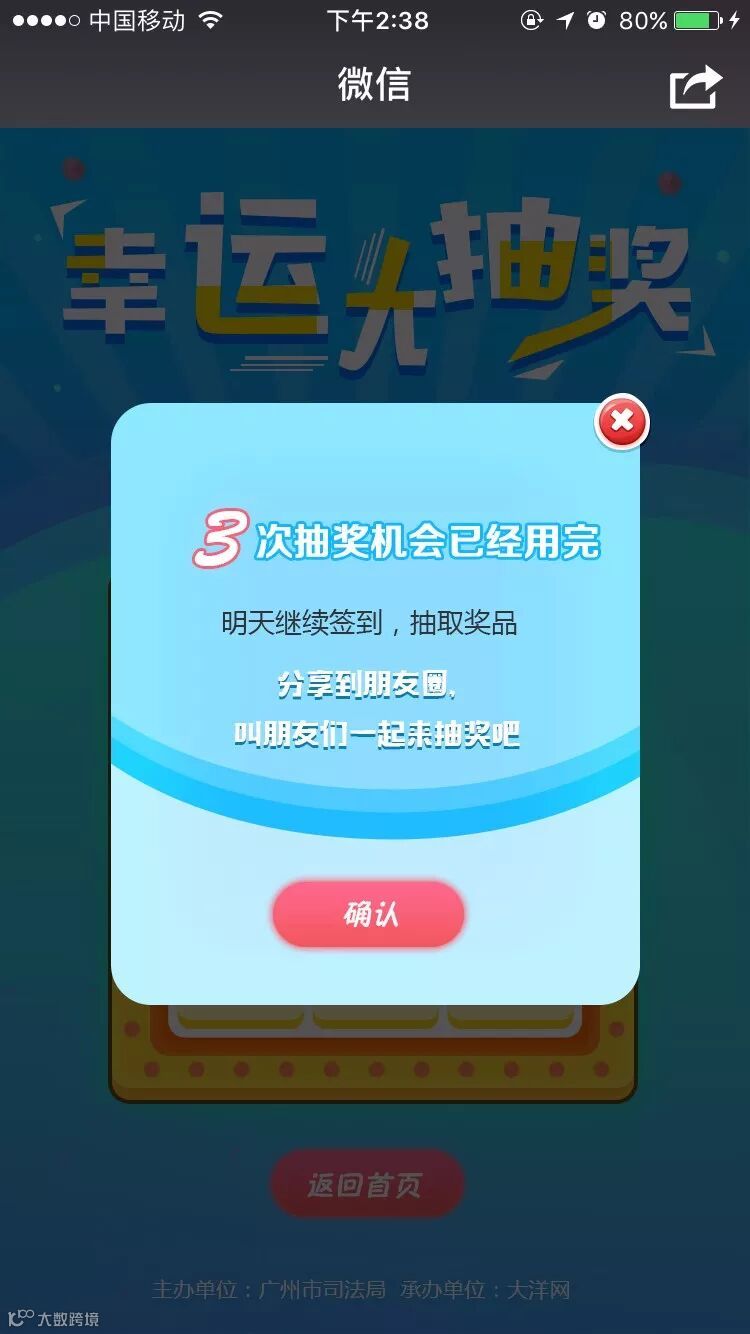 活动期间,“广州普法”微信粉丝每天签到后可参与1次抽奖,分享到朋友圈后可额外获得1次抽奖机会;累计达到规定天数可获得3次抽奖机会。