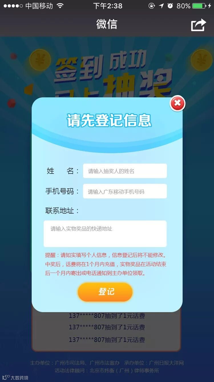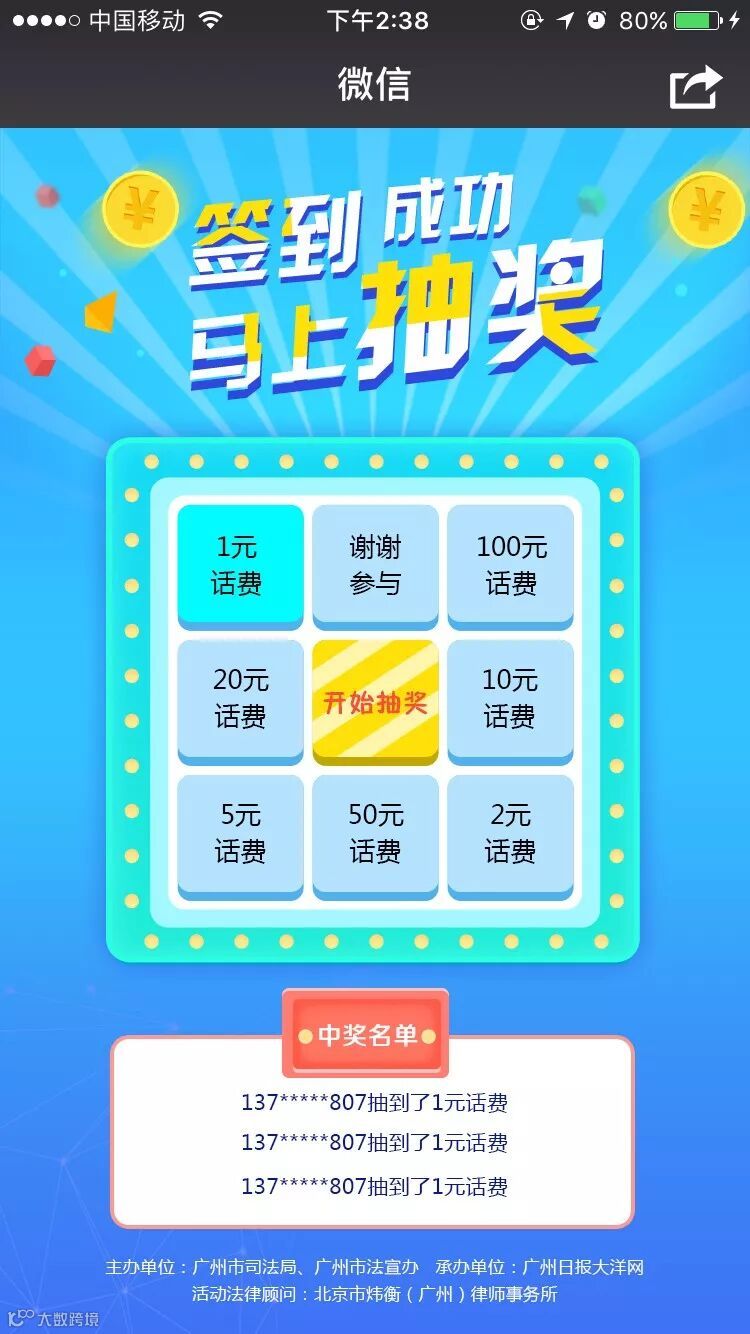 1.每天签到奖品设置:微信用户每天打卡,可获得1次抽奖机会。奖品为面值1/2/5/10/20/50/100元的广东移动话费。