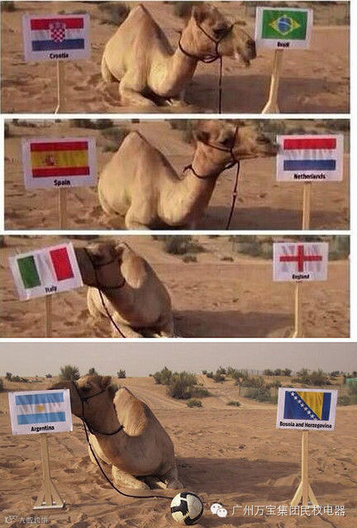 迪拜骆驼沙欣成了目前最“火”的世界杯预言帝。每场比赛前,工作人员把两队的国旗和名字贴在两个相同木牌上,沙欣趴在后方,看不到国家的旗帜和名字。它在思考后会走上前把头扭向认为会获胜的一方或者直接走到牌子旁用嘴叼起这个国家的牌子,目前它已4连胜。