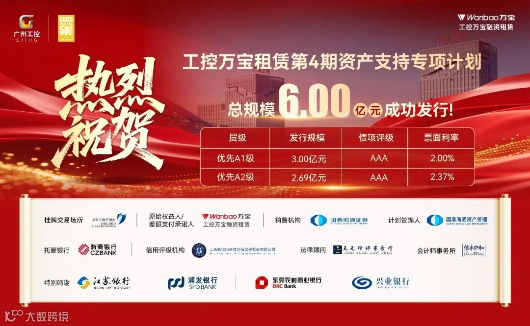2月11日,广州工控万宝融资租赁有限公司(以下简称工控万宝融资租赁)20亿元储架ABS项下“工控万宝租赁第4期资产支持专项计划”在深圳证券交易所成功发行,发行规模为6亿元,优先档加权票面利率2.17%,实现2026年直接融资工作“开门红”,为全年业务发展奠定坚实资金基础。