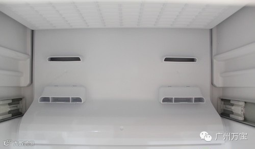 风冷冰箱内装有一翅片式蒸发器和一套风道循环组件,风扇电机将通过蒸发器冷却后的箱内空气形成上下循环,从而使冷气均匀分布于冰箱各个间室,达到制冷的目的,即运用风扇循环流动冷气的冷却方式。从下图中我们可以直观的看到风冷系统的结构,风扇左右两边是出风口,下面是蒸发器。