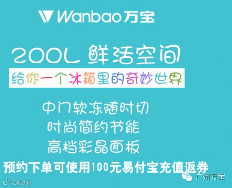 凡是5月1日12点前在微信朋友圈内转发“广州万宝”微信公众平台订阅号发布的万宝冰箱苏宁预售信息,并收集点赞88个以上的朋友,将截屏、真实姓名、联系电话发送到“广州万宝”公众平台(微信订阅号:gzwbce)予以确认后,由广州万宝集团赠送话费88元。