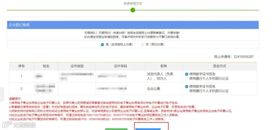 12. 是(网上全流程办理),勾选使用“数字证书签名”,里的数字证书是用于后面文档的电子签名(CA、银行U盾、网证通等数字证书)