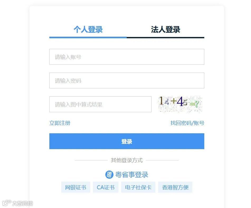 3、登录,有账号的可以选择个人或法人进行登录,没有账号的可以注册,或者直接使用粤省事进行人脸识别