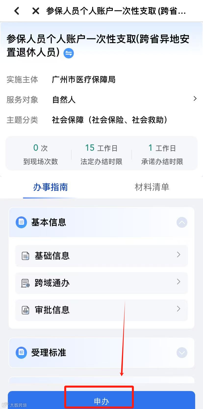 2.选择办事情景后点击“确定”,再点击“申办”。