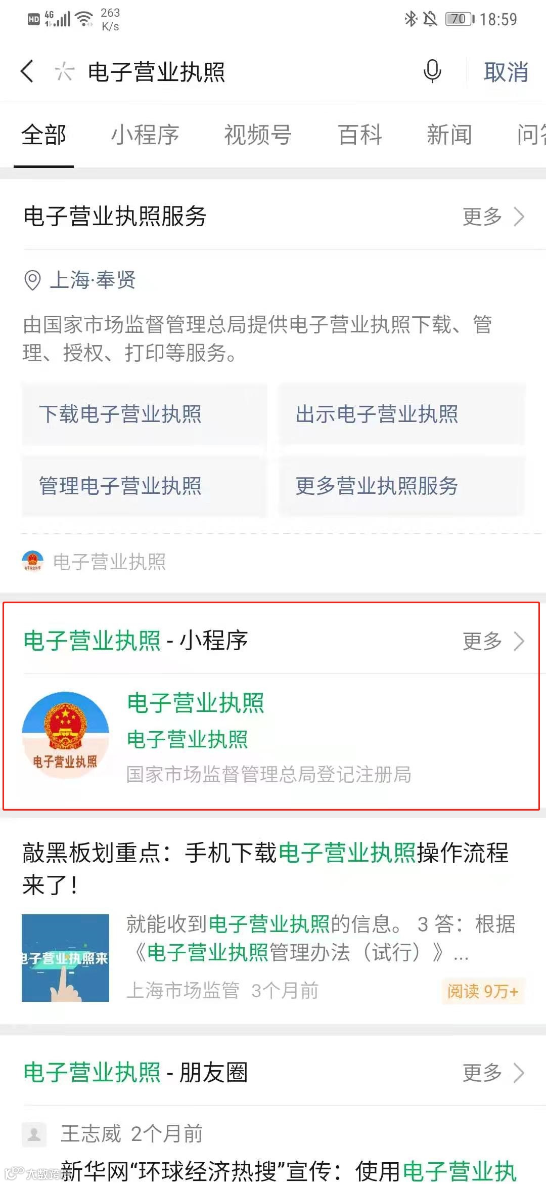 1、领取电子营业执照需要首先安装电子营业执照小程序。在微信、支付宝App中搜索“电子营业执照”微信小程序,在查询结果中点击“电子营业执照”即可安装。